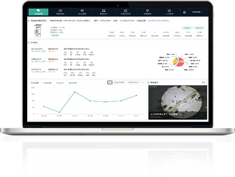 云平臺(tái)或APP上實(shí)時(shí)查看設(shè)備分布點(diǎn)位、工作狀態(tài)、電池電量等,進(jìn)行功能設(shè)置等設(shè)備管理操作;可視化顯示害蟲(chóng)圖片、種類數(shù)量、變化趨勢(shì),智能分析蟲(chóng)情報(bào)告,基于農(nóng)業(yè)知識(shí)圖譜推薦蟲(chóng)害防治方法。
